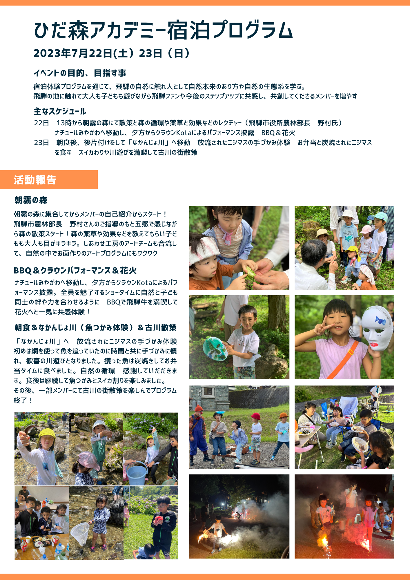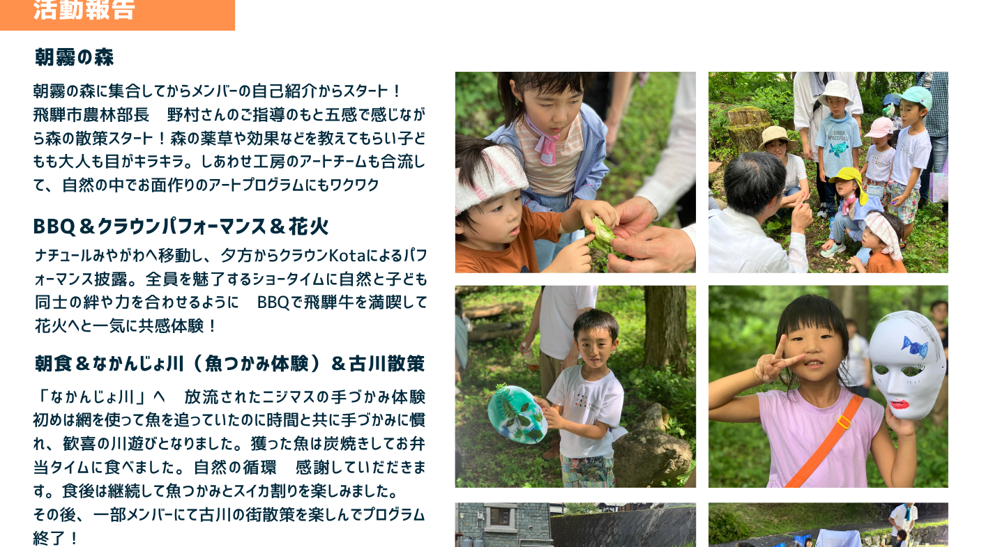 子どもたちが自然の中に馴染む姿を実感する2日間。森の空気、植物を見て匂い、触り五感をフル活用して楽しみながら、森林の中で楽しむお面づくりのアードプログラムもありました。夕方からはクラウンKoTaによるパフォーマンスも披露され美味しい飛騨牛に感激! 夜は手持ち花火で盛り上げり大人も子どもも目一杯楽しみました。翌日はなかんじょ川で魚のつかみ取りをして、捕まえた魚を塩焼きにしてお昼にいただく時間、スイカ割りもして時間もあっという間に過ぎ移動タイム 最後に希望者が飛騨市の観光をして終了。わずかな時間でたくましくなり、自然と一体となる体験をしてきました。