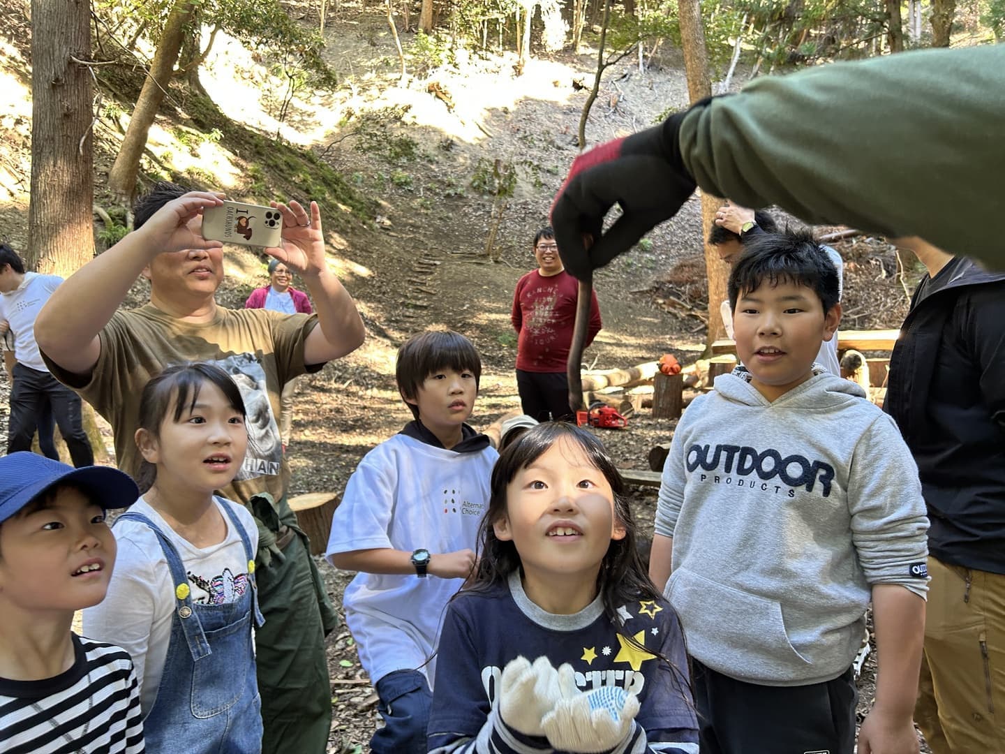 森の整備も急ピッチで行われ、テーブルに丸太椅子がランチタイムの憩いの場へ。さらに斜面に作られた絶景Newスポットにワクワク! 新規メンバーも数家族参加してごちゃまぜに揉まれて逞しくなっていく姿を数時間で体感! 体験を通して「自分にはできる」という確信を得る強さを感じる瞬間でした。